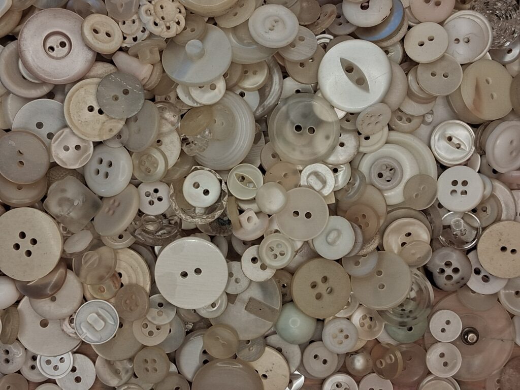 All buttons are reclaimed and recycled ready for you to repurpose. Whatever your project, sewing or art, the button you need is already out there in the world. Why buy new? All my buttons have been collected from old button boxes and charity shops and old garments. All buttons are washed, properly dried and de-threaded. By their very nature, they are imperfect. If you don’t like flaws, if you are looking for perfect, then buying new is probably best for you. If you prefer a little humanity in your buttons then you are in the right place.