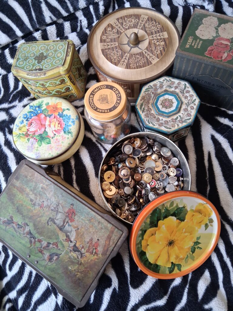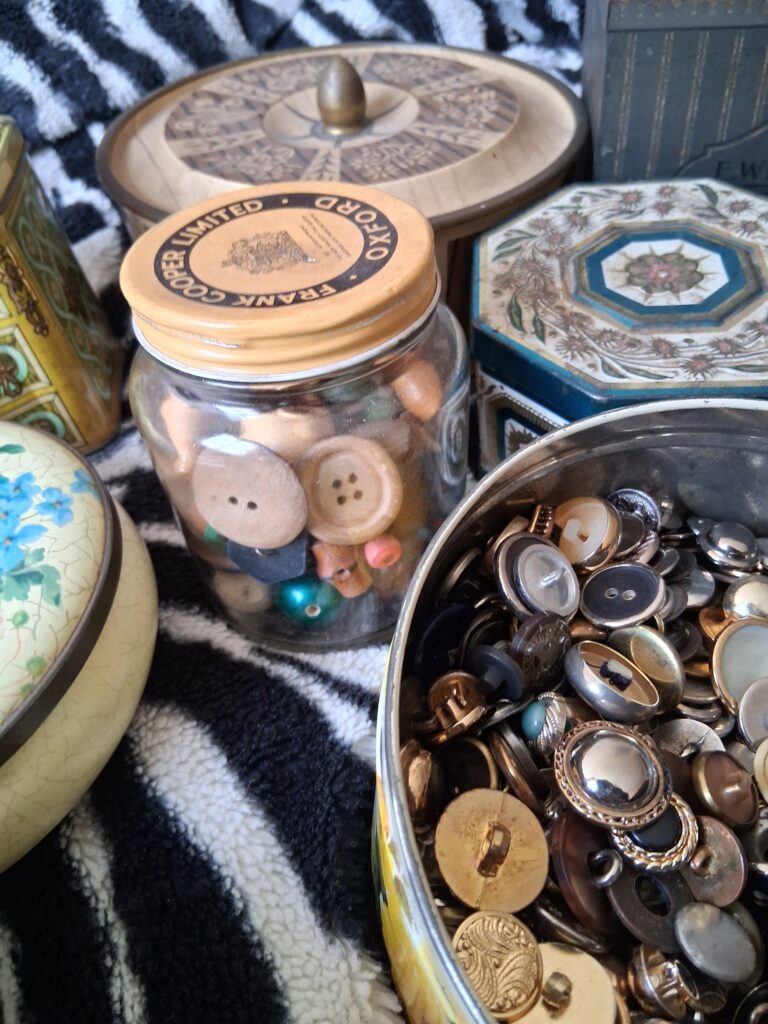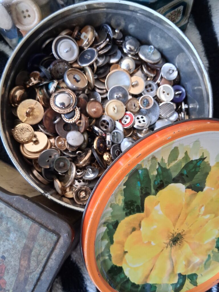 You may also find some very old exciting button tins. Discovering a new tin full of buttons is such fun. People keep all sorts of old stuff in them. I love looking through them. I am mindful of the fact that each tin probably comes from someone who has most likely passed away. Keeping all buttons and bits and pieces is less popular now. I hope to liberate some of these items in my shop.
