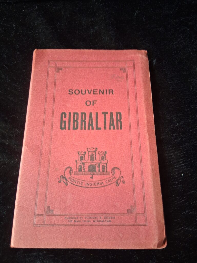A beautiful booklet of postcards from approx 1910. These are photographs which have been coloured. No cars, only horse and trap in the pictures. Delightful collection of souvenir cards from Gibraltar, publisher Vincent Cumbo on Main Street, Gibraltar. There are 9 cards in the book, possibly originally 10? I don’t know. Size approx 15cm x 9.5cm. The card cover is also in good condition as are the cards. Collectable item.